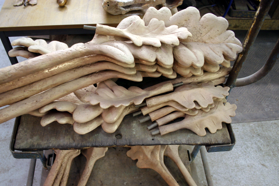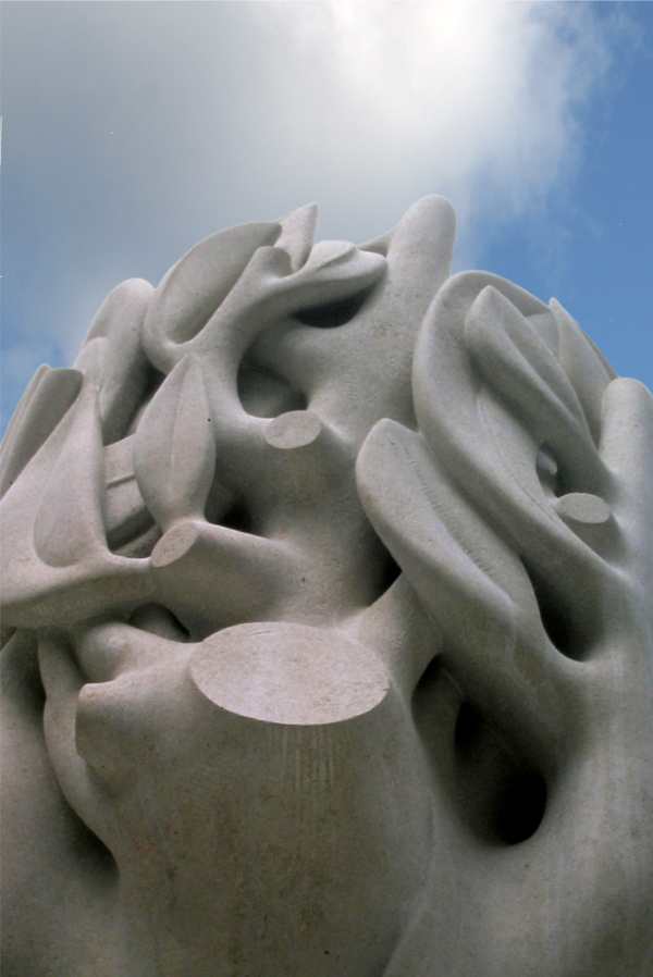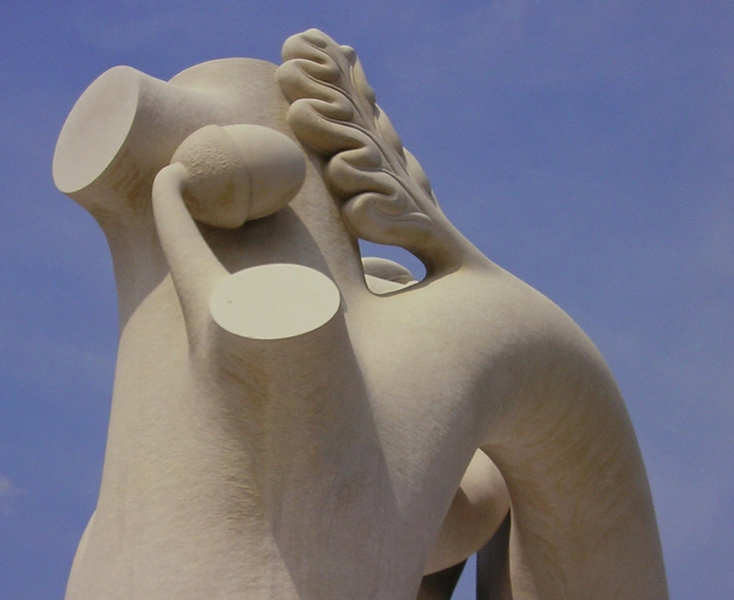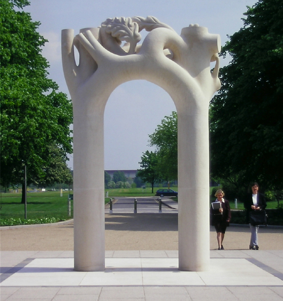 Interlocking Oaks, 2000. 4.5m high, carved Portland stone. Commissioned by The Boots Company for their Group Headquarters. Assisted by Richard Holiday and Harry Gray.