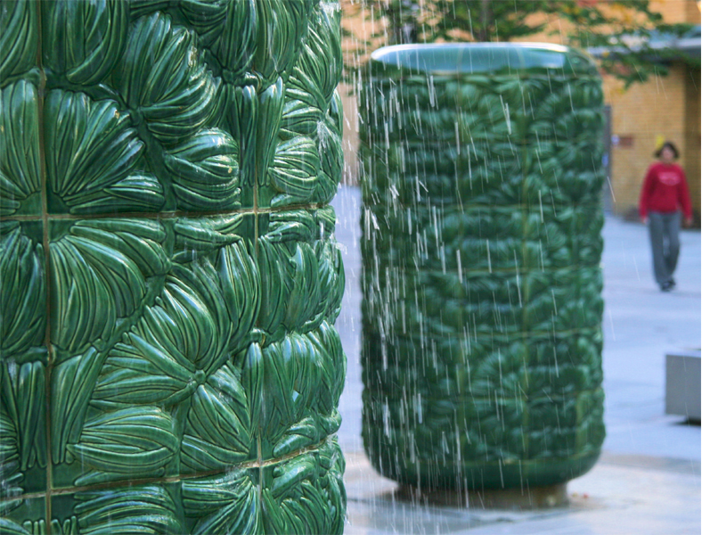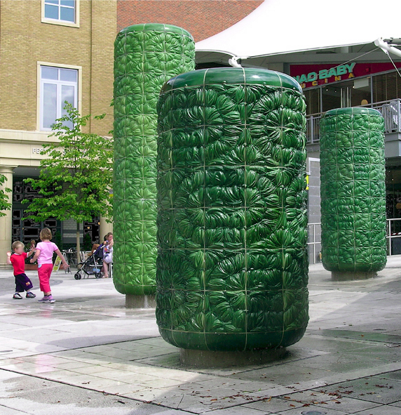 Fountain Trees, 2002. Festival Square, Basingstoke. 5 ceramic sculptures (3 water columns, 2 marker pieces): 4, 3, 2, and 1m high. Commissioned by Grosvenor Estates.