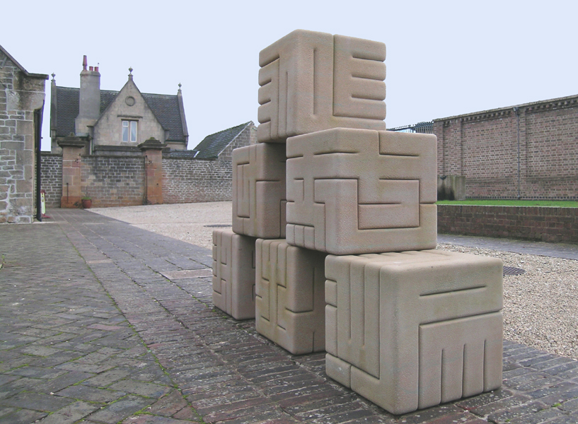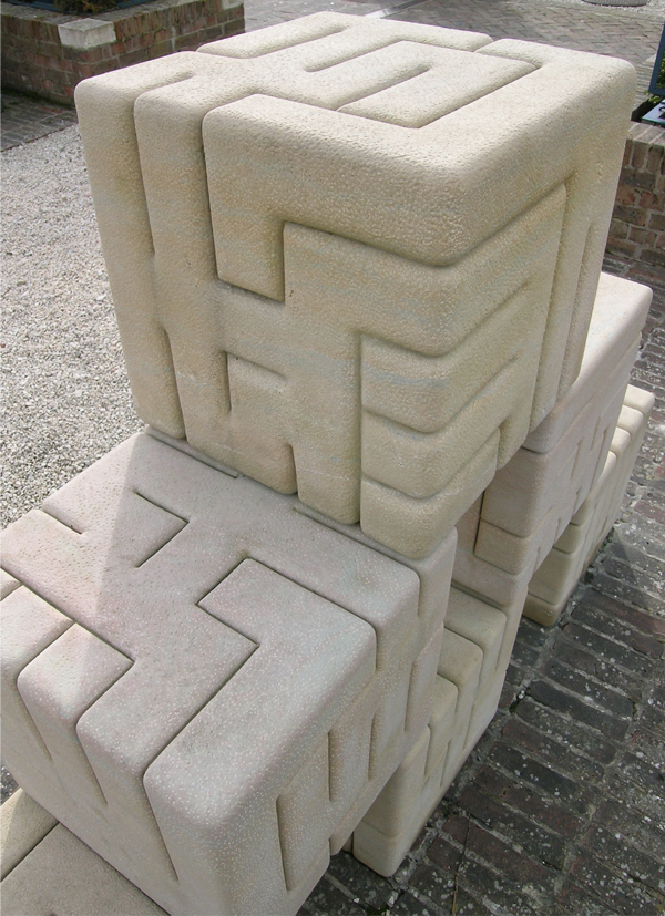 Harley Cubes, 2003. 6 carved cubes, 42x42x42cm, Mansfield White stone. Commissioned by The Harley Foundation for The Harley Gallery Courtyard.