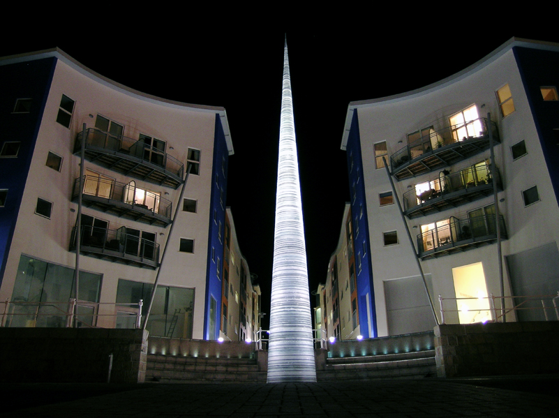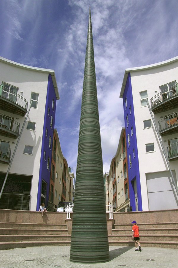 Needle, 2004. 14m high, slate. Albert Pier, St. Helier. Commissioned by Jersey Public Sculpture Trust. National Stone Federation Award, 2006. Opened by HRH Prince Charles.