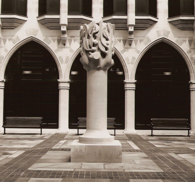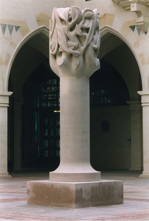 Northampton Tree, 1992. 3.5m high carved Portland Stone sculpture. Commissioned by Northampton City for the new Guildhall extension. Opened by HM The Queen.