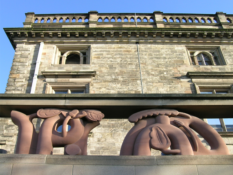Six Figures, 1997. Nottingham Castle Museum and Art Gallery. 6 carved Red Wilderness sandstone sculptures, forming a 600mm high x 10m long balustrade. Assisted by Graeme Mitcheson. Commissioned by Nottingham City Council. NCC Design Award, 1997.